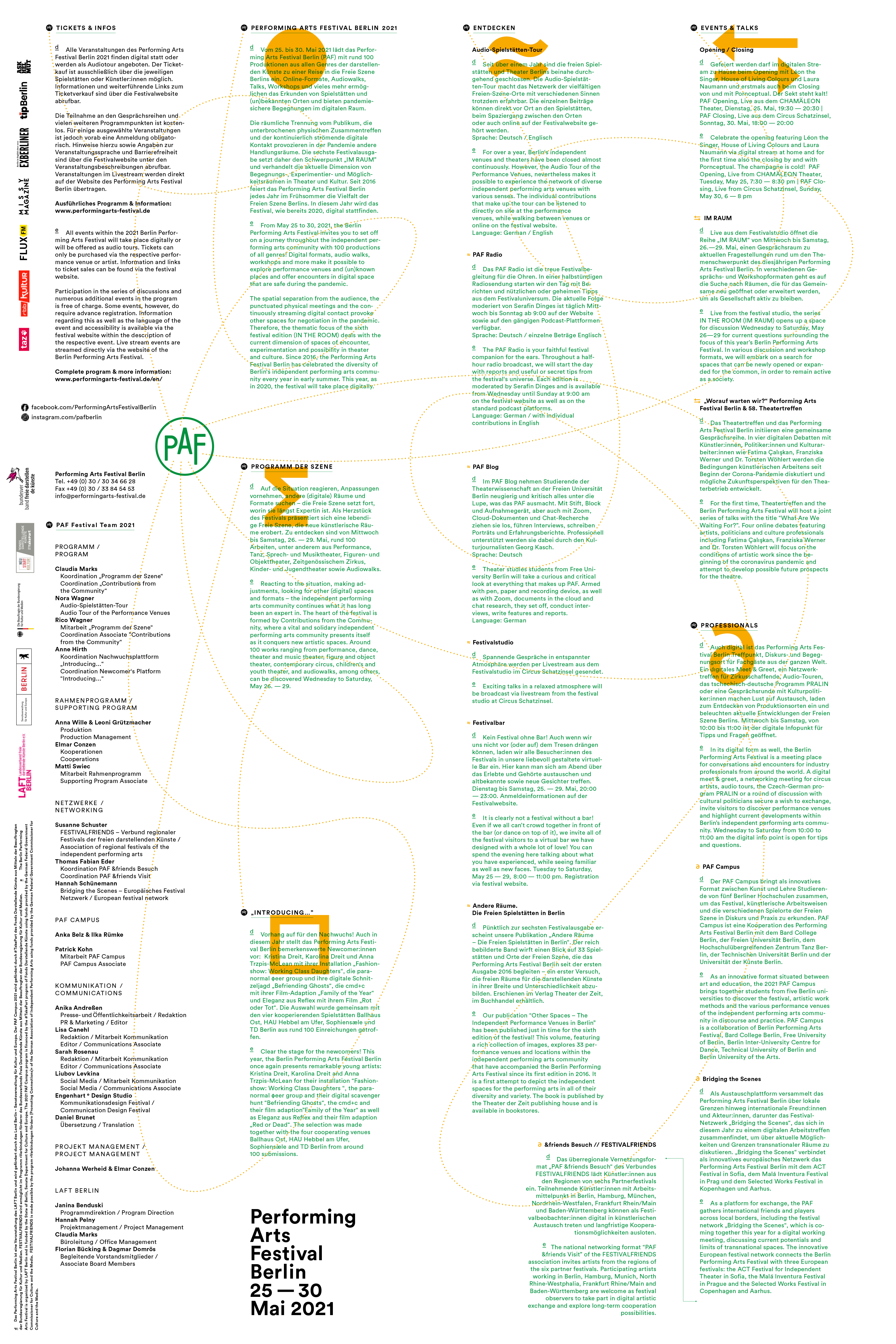 In unserem Flyer zum Performing Arts Festival Berlin 2021 lassen sich alle Informationen rund um das Festival gebündelt nachlesen. Er steht sowohl zum Download als PDF als auch zur direkten Betrachtung auf dieser Seite bereit.