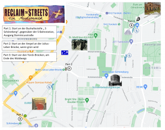 What kind of city will Berlin be tomorrow? What can we change? What can we do for the neighborhood we live in and help to shape and what have we already been able to do in it? The audio walk Reclaim the Streets not only guides us through the animated history of Schöneberg, but also sweeps us away into a world where urbanity needs to be defined anew.